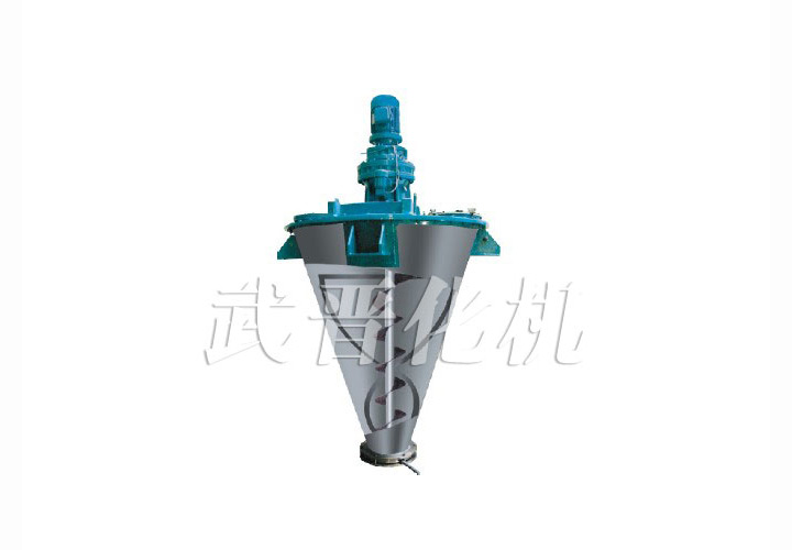 由摆线针轮减速机连接中心螺杆及外层螺带以相同转速转动。工作时,中心螺杆将混合物料由底部提升到顶部,同时线速度较大的外部螺带将物料由下而上沿锥形筒壁盘提升,二种运动在离心力作用下又将物料沿切线方向抛向空间,物料产生强烈的对流剪切、扩散,从而达到快速混合的目的。(螺杆也可做成反向螺杆)。